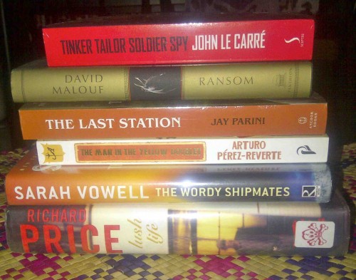 Tinker Tailor Soldier Spy by John LeCarré, Ransom by David Malouf, The Last Station by Jay Parini, The Man in the Yellow Doublet by Arturo Perez Reverte, The Wordy Shipmates by Sarah Vowell, and Lush Life by Richard Price.