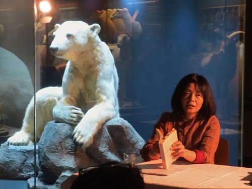 Yoko Tawada during a reading in front of the sculpture of Knut at Berlin’s natural-history museum. Credit Photograph from Yoko Tawada