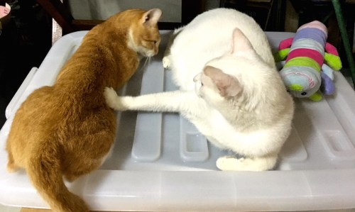 Drogon Targaryen-Targaryen explains the ways of the household to the new cat, Jacob Totoro Howlett.